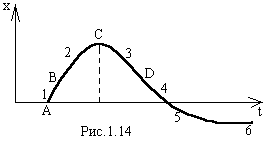 Рис.1.19 Задача 13. Дан график зависимости скорости от времени. Изобразить графики зависимости ускорения, координаты и пути от времени (рис.1.20).