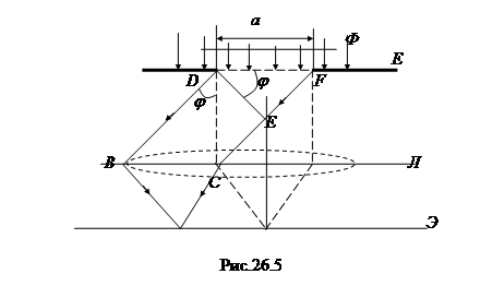 Дифракция Фраунгофера наблюдается в том случае, когда источник света и точка наблюдения бесконечно удалены от препятствия, вызвавшего дифракцию. Чтобы осуществить дифракцию в параллельных лучах (дифракцию плоских световых волн), достаточно источник света поместить в фокусе собирающей линзы (Л), а дифракционную картину исследовать в фокальной плоскости второй собирающей линзы, установленной за препятствием. Пусть плоская монохроматическая световая волна падает нормально плоскости щели шириной а (рис. 26.5). Оптическая разность хода между крайними лучами DB и FC, идущими от щели в произвольном направлении
