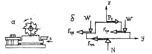 1.Изобразите схему равновесия детали под действием всех сил. Для этого изолируйте деталь от остальных элементов системы и замените их действие силами. Например, на рисунке 1.8, а заготовка удерживается двумя прихватами на операции фрезероваьше плоскости цилиндрической фрезой. На рис. 1.8, 6 деталь изолирована от инструмента, зажима и опоры. Действие отброшенных элементов на деталь заменили сила Р2, силы зажима ^т и реакция опоры N.