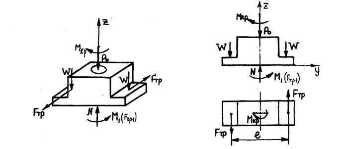 На рисунке 1.12 действие сверла на заготовку заменяет усилие подачи Р0 которое прижимает деталь к опоре и вращающий момент Мкр от пары сил РZ, который стремиться провернуть заготовку относительно оси сверла по часовой стрелке. Установочная плоскость приспособления действует на заготовку с силой нормального давления N, два зажимных механизма - с силой W каждое. Базовые поверхности, не воспринимающие силы зажима, при расчете разгружают от сил резания. Они не дают опорных реакций, так как не нагружены активными силами. Графическая модель равновесия заготовки, позволяет составить систему уравнений равновесия и решить ее относительно сил зажима W. Поскольку усилие подачи не сдвигает, а помогает удержать заготовку в равновесии, силу зажима следует искать из условия, что вращающий момент Мкр не провернет ее относительно оси сверления Z. Неизвестных сил на схеме две - W и N, значит можно составить и решить систему из двух уравнений, вида: