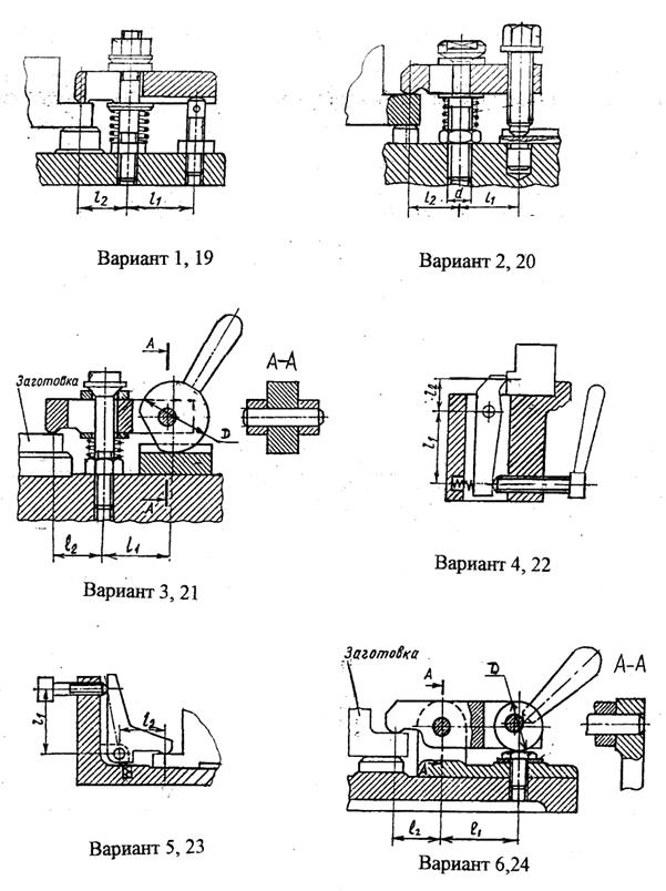 Схемы закрепления заготовки комбинированными зажимами к задаче. Прихваты резьбовые и эксцентриковые отводные (схемы 1, 2, 3, 4) и качающиеся.