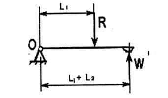 Рисунок 2.3 – Расчетная схема рычага В конце зажима рычаг неподвижен под действием моментов от силы реакции заготовки W и усилия со стороны гайки R. (см. рис.2.3). Чтобы найти неизвестную силу R давления гайки на рычаг, равновесие Например, отсутствие поворота рычага относительно точки О опоры SMо(Fi) = 0 W´ (L1+L2) - R´ L1 = 0 R = W´ (L1+L2)/ L1 Чтобы составлять для рычага уравнения в проекциях или рассматривать сумму моментов всех сил относительно любой другой точки кроме шарнирной опоры, необходимо освободить рычаг и от опоры, заменив ее действие реакциями связи.