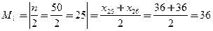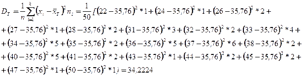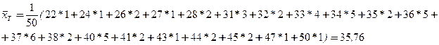 Мысал. Ө те ү лкен ампулалар партиясынан кө лемі 50 болатын кездейсоқ таң дама алынды. Х белгісі – 1 см-ге дейінгі дә лдікпен ө лшенген ампулалардың ұ зындығ ы келесі вариациялық қ атар тү рінде берілген: 22, 24, 26, 26, 27, 28, 28, 31, 31, 31, 32, 32, 33, 33, 33, 33, 34, 34, 34, 34, 34, 35, 35, 36, 36, 36, 36, 36, 37, 37, 37, 37, 37, 37, 38, 38, 40, 40, 40, 40, 40, 41, 41, 43, 44, 44, 45, 45, 47, 50. Таралудың статистикалық дискретті, интервалдық қ атарларын, мода, медиана, таң дама ортасын, дисперсияны, орта квадраттық ауытқ у, сенімділік интервалын табу керек жә не тең қ адаммен жиілік жә не салыстырмалы жиілік гистограммасын тұ рғ ызу керек. Таң даманың қ алыпты таралу заң ына бағ ынатындығ ын немесе бағ ынбайтындығ ын тексеру керек (3 сигма ережесінің орындалуы). Шешімі. Таң даманың дискретті статистикалық таралуы