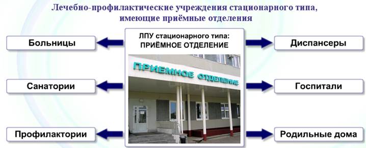 ИНФОРМАЦИОННЫЙ БЛОК по теме «Осуществление приема пациента в стационар» Приемное отделение — одно из важнейших лечебно-диагностических отделений больницы. От организации профессиональной помощи медперсоналом зависит успех последующего лечения, а также жизнь пациента. Основной поток пациентов поступает через центральное приемное отделение. Прием инфекционных пациентов, рожениц осуществляют децентрализованно в соответствующие подразделения (инфекционное отделение, роддом) в целях соблюдения санэпидрежима. Больных, требующих неотложной помощи по жизненным показаниям, доставляют в реанимационное отделение, минуя приемное. Приёмное отделение является структурным подразделением больницы, обеспечивающим приём больных.