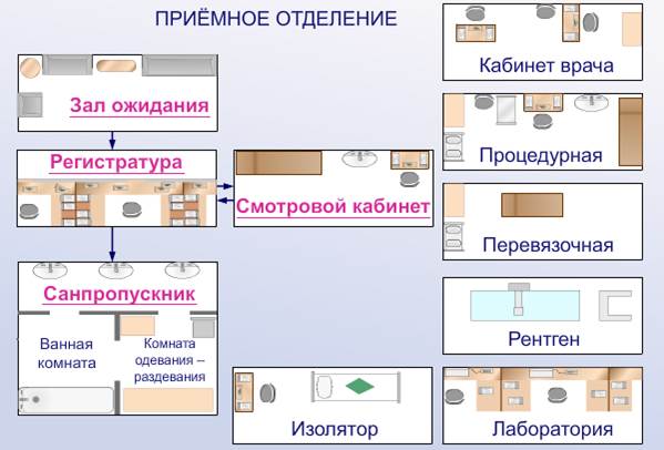 СОСТАВ ПРИЕМНОГО ОТДЕЛЕНИЯ Ø Зал ожидания - для пациентов, их сопровождающих. Здесь должно быть достаточное количество стульев, кресел, телефон справочной службы больницы. Ø Кабинет дежурной медсестры - здесь производится регистрация поступающих пациентов, оформление необходимой документации. Ø Смотровые кабинеты - для осмотра пациентов врачами (терапевт, хирург, гинеколог). Ø Процедурный кабинет. Ø Перевязочная, малая операционная. Ø Санпропускник - для санитарной обработки пациентов (ванна, комната для переодевания). Ø Изолятор с отдельным санузлом - для пациентов с неясным диагнозом. Ø Рентгенткабинет. Ø Лаборатория. Ø Санузел.