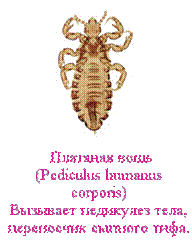 | Заболевание вызывается вшами беловато-серого, коричневого цвета с размерами, превосходящими головных вшей. Этот вид вшей обитает в складках одежды, откуда впоследствии переходит на кожу человека. Наиболее часто поражаются места соприкосновения складок и швов одежды с кожными покровами. Локализация вшей – поясничная, плечевая, шейная области, верхняя часть спины, пахово-бедренные складки, живот, подмышечные впадины. Платяные вши являются переносчиками возбудителей сыпного тифа, волынской лихорадки и возвратного тифа. Пути передачи: Насекомые попадают к здоровому человеку при тесном бытовом контакте. Заражение может произойти при использовании грязных вещей, постельного белья. Поражаются асоциальные пациенты, плохо соблюдающие личную гигиену взрослые и дети. Основные симптомы педикулёза тела: нестерпимый зуд, ведущий к расцарапыванию кожи и присоединению вторичной инфекции в местах укуса, синюшные пятна, высыпания на коже (неинфицированные укусы выглядят как красные прыщики диаметром 2-4 мм).