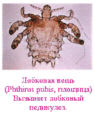 | Лобковые вши являются самыми маленькими представителями педикулеза человека. Паразиты имеют грязно-желтую, серо-коричневатую окраску. Лобковой вошью заражаются волосистые участки в области половых органов и заднего прохода (при выраженном оволосении тела паразитов обнаруживают и в других местах). Лобковые вши очень плотно прикрепляются к волосяному стержню у его основания. Хоботок вши находится в устье фолликула, а хвостовая часть – у основания волоса, и определяется в виде сероватой точки. Гниды телесного цвета откладываются у устья волоса и находятся также на волосах. Пути передачи: Основной причиной заболевания взрослых являются половые контакты, дети заражаются от взрослых, ухаживающих за ними. Основные симптомы лобкового педикулёза: сильный зуд. Возможна реакция на укусы в связи с попаданием в кровь слюны насекомого в виде синюшно-голубых пятен. Пятна не исчезают при надавливании. На коже могут появиться: папулы, везикулы, экскорнации, шелушение, гемморагические корки. Могут развиваться пустулы, дерматит, экземоподобная реакция.
