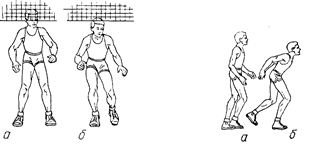 Исходным положением называется поза игрока, удобная для выполнения технического приема. Исходное положение волейболист принимает после передвижения к мячу или сразу же из игровой стойки. Отличительной чертой исходного положения является подготовка опорно-двигательного аппарата спортсмена к выполнению конкретного технического приема. Исходное положение предшествует подготовительной фазе технического приема и применяется перед верхними (рис. 18) и нижними (рис. 19) передачами, перед блокированием (рис. 20) и нападающим ударом (рис. 21). Исходные положения характеризуются некоторой статичностью позы игрока. При этом ноги в большей или меньшей степени сгибаются в коленных и голеностопных суставах, руки подготавливаются к приему мяча или другим движениям, необходимым для выполнения технического приема. Мышцы туловища и рук волейболиста расслаблены, взгляд сконцентрирован на мяче. Время, в течение которого игрок находится в исходном положении, исчисляется десятыми долями секунды.