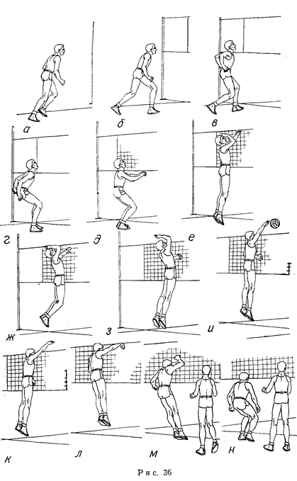 Прямой нападающий удар может осуществляться по ходу разбега и с переводом. В первом случае направление траектории полета мяча после удара как бы совпадает с направлением разбега. Во втором с помощью своеобразных движений туловища и ударяющей руки мяч посылается вправо или влево по отношению к направлению разбега волейболиста. Техника прямого нападающего удара по ходу разбега представлена на рис. 36. Как видно, в последнем шаге разбега — напрыгивании — левая нога волейболиста, незначительно согнутая в коленном суставе, ставится на поверхность площадки с пятки. Такая постановка стопы способствует стопорящему движению, которое необходимо для перевода горизонтальной скорости разбега в вертикальную при отталкивании. Максимально увеличивая скорость при напрыгивании, игрок сгибанием ног в коленных и тазобедренных суставах опускает ОЦТ вниз, при этом правая нога, согнутая в коленном суставе, выносится вперед и ставится