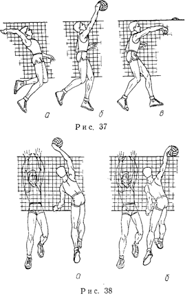 рядом с левой. Руки для предстоящего махового движения вперед-вверх отводятся назад-вниз. Фаза отталкивания от опоры начинается с маховых движений рук еще до активного разгибания ног в момент приставки правой стопы к левой. При этом ОЦТ вследствие увеличения угла сгибания ног в коленных и тазобедренных суставах продолжает смещаться вниз и оказывается вынесенным за опору. Снижение ОЦТ вниз и смещение его за опору позволяют значительно увеличить его путь во время преодолевающей работы мышц ног, что способствует достижению большей величины вертикальной скорости движения тела в заключительной микрофазе отталкивания. Активное разгибание ног в тазобедренных и коленных суставах, а также энергичное сгибание стопы осуществляется за счет взрывной работы мышц этих звеньев н завершается упругим отталкиванием стоп от поверхности площадки. В начале безопорной фазы туловище и ноги игрока выпрямлены, левая рука после махового движения прекращает смещение вперед-вверх, а правая, согнутая в локтевом суставе, продолжает отводиться назад. Тело волейболиста в результате силы толчка вверх и инерции горизонтальной скорости разбега перемещается вперед-вверх. При дальнейшем подъеме туловище игрока прогибается в поясничной части позвоночника, правое плечо и рука отводятся назад и в сторону, левая, согнутая в локтевом суставе, смещается вниз, ноги сгибаются в коленных суставах. В результате всех этих движений мышцы плечевого пояса, груди и живота хорошо растягиваются, создавая необходимые условия для концентрации усилий в ударном движении. Удар по мячу производится в высшей точке прыжка. В результате энергичного сокращения больших мышечных групп груди и живота туловище волейболиста разгибается в поясничной части позвоночника, а ноги — в коленных суставах, правое плечо смещается вперед-вверх, а правая рука, разгибаясь в локтевом суставе, движется по большой амплитуде навстречу мячу. При ударе происходит обгон дистальных частей руки: плечо обгоняет плечевой сустав, локтевой сустав обгоняет плечо и кисть — предплечье. Угол между плечом и предплечьем в момент удара составляет приблизительно 140—150°. Подобное захлестывающее движение руки в сочетании с разгибанием туловища и «навалом» правого плеча способствует значительному наращиванию силы в момент удара. После удара по мячу (заключительная фаза) тело игрока по дуге опускается вперед-вниз. Волейболист приземляется в 1—1, 5 метрах от места отталкивания на согнутые в коленных суставах ноги, туловище игрока несколько наклонено вперед, руки, согнутые в локтевых суставах, находятся на уровне пояса. Техника прямого нападающего удара с переводом влево представлена на рис. 37. Удар выполняется со средней (по высоте) передачи, разбег и прыжок обычны. В фазе замаха волейболист всеми своими движениями показывает, что нападающий удар будет производиться по ходу разбега (рис. 37, а). В этом и заключается мастерство нападающего, то есть умение в последний момент резким движением предплечья и особенно кисти перевести мяч влево, мимо рук блокирующего.