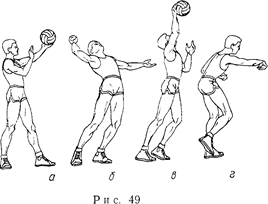 В исходном положении для всех способов техники верхних подач волейболист становится лицом к сетке или в полоборота к ней. Поддерживая мяч левой рукой на уровне пояса, игрок равномерно распределяет вес тела на обе ноги, правая рука, согнутая в локтевом суставе, подготавливается к замаху, взгляд игрока направлен на площадку соперничающей команды. Подготовительная фаза верхней подачи с несильным, но точным ударом (рис. 48) заключается в укороченной амплитуде замаха, незначительном сгибании правой, опорной ноги и очень небольшом отклонении туловища назад для его последующего активного движения в момент удара. При этом мяч подбрасывается вверх на 30—40 см (рис. 48, а, б, в). Во второй фазе этого способа подачи волейболист, выпрямляя опорную ногу и перенося вес тела на впереди стоящую левую ногу, коротким прицельным ударом производит подачу, направляя мяч в намоченный участок площадки. В момент удара игрок переводит взгляд с поля противника на мяч и концентрирую г внимание на заключительной части ударного движения, которое производится главным образом за счет движения правой руки и почти без активного участия туловища и ног (рис. 48, г, д, е).