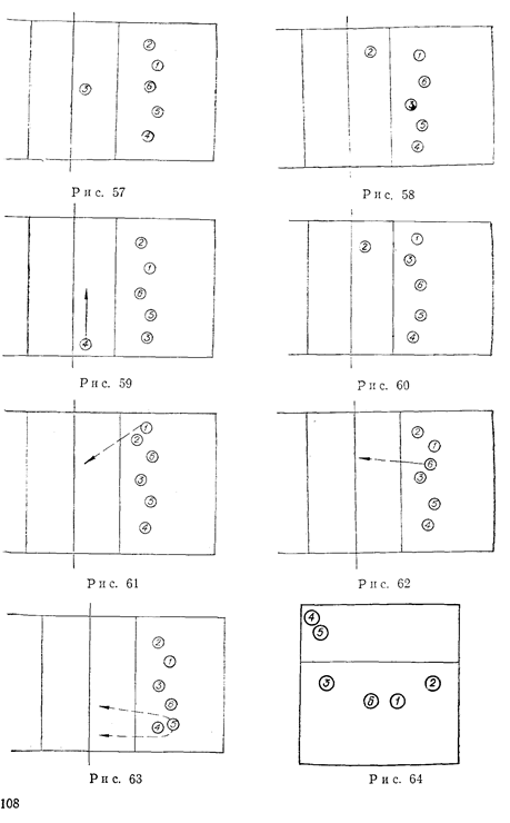 На рис. 61 функции выходящего игрока выполняет игрок зоны 1. При этом его зону страхуют игроки зон 2 и 6. Если выходящим игроком является волейболист зоны 6, то расстановка будет такой, как показано на рис. 62. Выход связующего игрока из зоны 5 применяется значительно реже. Расстановка игроков при выходе связующего волейболиста из зоны 5 показана на рис. 63. Одним из общих принципов расположения игроков на поле во всех системах игры является группировка игроков в середине площадки. Это обусловлено тем, что большинство мячей с подачи попадает в центральную часть площадки.