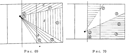 или попасть туда в результате отскока от рук блокирующего. В данной ситуации а и а\ — наиболее вероятные сектора поражения; поэтому игроки, расположенные в этих секторах, должны быть особенно готовы к игре в защите. При «глубоком» ударе мяч может быть направлен и в сектора б, в\, в связи с чем игроки этих секторов должны быть готовы не только к страховке, но и к защитным действиям. 2. Если прямой удар соперника, находящегося в зоне 4, перекрыт групповым блокированием, то особенно опасным может стать сектор а, где в защите играет волейболист зоны 1 (рис. 68). 3. Атака производится из зоны 4, групповым блоком закрыт удар с переводом в сектор а и удар в сектор б. Особенно уязвим для проведения атаки нападающим ударом сектор в (рис. 69). 4. Аналогично располагаются игроки обороняющейся команды при нападении из зоны 2 (рис. 70). 5. Нападающий удар производится из зоны 2, групповым блоком закрыты зоны 1, 2 и 6. Мяч от удара может быть направлен в зону 5 (рис. 71). 6. Нападающий удар выполняется из зоны 2, групповым блоком закрыты зоны / и 5. При близкой передаче мяча к сетке возможное направление ударов — в зоны 2 и 4 (рис. 72).
