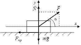 Задача 5. Определить силу трения, действующую при движении тела по горизонтальной поверхности, если на тело массой m = 1 кг действует сила 10 Н под углом a = 60° к горизонту. Коэффициент трения равен m = 0, 1. С каким ускорением будет двигаться тело (рис.4.)?