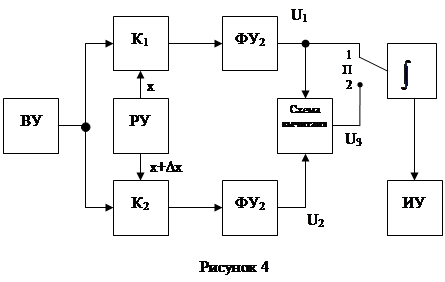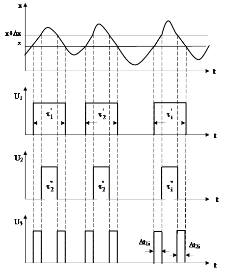 Для определения ∆ t¢ i=∆ t1i+∆ t2i= τ ¢ i– τ ² i. (10) Анализаторы, реализующие данный метод, могут быть как аналоговыми, так и цифровыми. Структурная схема аналогового анализатора предоставлена на рисунке 3. С помощью ВУ обеспечивается уровень сигнала, необходимый для нормальной работы других функциональных узлов измерителя. Компараторы К1 и К2 выполняют функции амплитудных селекторов и имеют уровни срабатывания х и х+∆ х соответственно. Эти уровни задаются регулятором уровня (РУ) и могут изменяться при одновременном обеспечении постоянства ширины дифференциального коридора ∆ х. Таким образом сигналы на выходе К1 и К2 имеют вид импульсов U1 и U2 (рисунок 3), длительности которых соответственно равны τ i’ и τ i’’. Формирующие устройства ФУ1 и ФУ2 стандартизируют эти импульсы по форме и амплитуде. Напряжения U1 и U2 позволяют измерить При измерении