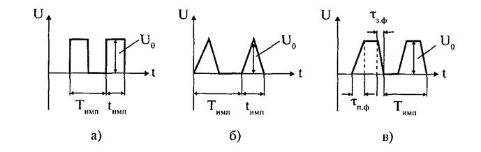 Если Импульсный смодулированный сигнал представляет собо непрерывную последовательность импульсов, которые могут иметь различную форму: а) прямоугольную, б) треугольную, в) трапецеидальную и др. (рис.2).