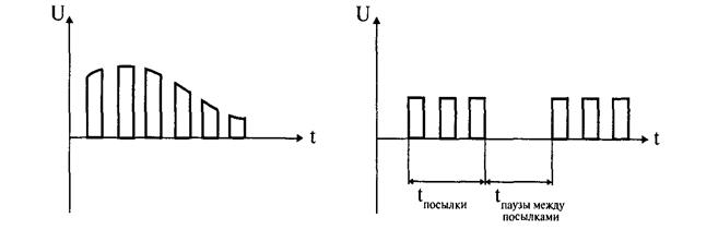 Характеристики импульсного немодулированного сигнала являются постоянными величинами в течение всего времени процесса. Амплитудно-модулированные (а.м.) импульсные сигналы образуются, если на непрерывную последовательность импульсов чистотой ν имп, воздействовать модулирующим сигналом с частотой ν мод. Всегда выполняется условие ν имп > ν мод (или Тмод > Тимп). Модулирующий сигнал может быть и синусоидальным и импульсным. В первом случае получаем последовательность импульсов с меняющейся амплитудой, во втором случае — серии импульсов, чередующиеся с паузами. Такая серия называется посылкой (рис. 3).
