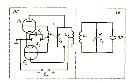 Аппарат УВЧ состоит из двухтактного лампового генератора (ЛГ) и терапевтического контура (ТК). Основными частями генератора являются: колебательный контур, включенный в анодную цепь, в котором возбуждаются незатухающие электромагнитные колебания, частота которых определяется индуктивностью LA и емкостью СA контура; источник электрической энергии ε А, за счет которого в контуре поддерживаются незатухающие колебания; электронные лампы Л1 и Л2, с помощью которых регулируется передача энергии от источника в контур, и катушка обратной связи LС, посредством которой осуществляется подача переменного напряжения из выходной цепи на сетки ламп. Воздействие электрическим полем УВЧ на пациента производится с помощью электродов пациента (ЭП), которые включены в терапевтический контур, индуктивно связанный с анодным колебательным контуром генератора. Индуктивная связь исключает возможность попадания пациента под высокое постоянное напряжение, которое всегда имеется в генераторе. Наибольшая мощность выделяется в терапевтическом контуре при условии резонанса, то есть тогда, когда частота собственных колебаний терапевтического контура совпадает с частотой колебаний, возникающих в анодном колебательном контуре генератора. Частота собственных колебаний контура зависит от его индуктивности L и емкости С: