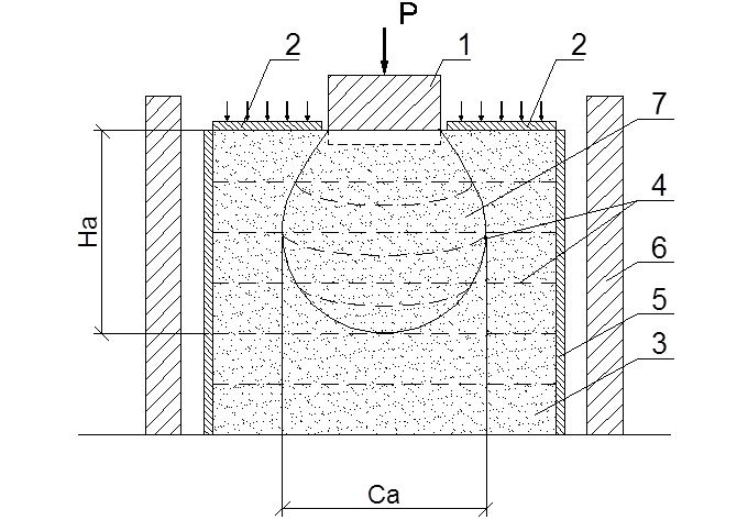 1. Центральный штамп; 2.Кольцевой штамп; 3.Образец грунта; 4.Фиксаторы; 5.Кольцо-грунтонос; 6.Ванна для воды; 7.Граница зоны деформации