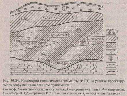 где yd — коэффициент надежности по грунту. Коэффициент надежности по грунту (yd) рассчитывают в зависимости от изменчивости характеристик грунта, числа определений и значения доверительной вероятности а, которое принимают в соответствии с рекомендациями норм проектирования различного вида сооружений. Число определений характеристик грунтов в этих методах должно быть не менее шести. Нормативные и расчетные значения характеристик грунта вычисляют для каждого инженерно-геологического элемента (ИГЭ). За ИГЭ принимают часть массива грунтов (слой, часть слоя, прослой, линза и т. д.), одного и того же происхождения, и литологического состава, которое может быть описано обобщенными показателями состава, состояния и свойств слагающего его грунта. Смысл выделения ИГЭ заключается в том, что несущественные различия в составе, состоянии и свойствах грунтов различных слоев позволяют объединить их в отдельный ИГЭ, что существенно упрощает расчет основания сооружения. При выделении ИГЭ необходимо учитывать не только геологические условия, но и расчетную схему сооружения; его тип и характер передаваемой на грунт нагрузки. Например, тонкие прослои глинистых грунтов при возможной работе грунтов основания на сдвиг следует выделять в отдельный ИГЭ или не выделять, если проектируемое сооружение рассчитывается только на сжатие. На рис. 36.24 (по М. А. Солодухину, 1985) показан пример выделения ИГЭ на участке проектируемого сооружения на свайном фундаменте. В самостоятельные ИГЭ, совпадающие с границами лито-логических и генетических разновидностей, выделены торф, озер-