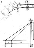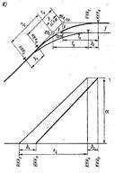 Если такой задачи не возникает, то обычно стремятся к тому, чтобы при смещении оси пути или уширении междупутья на кривой по возможности меньше переустраивать существующий путь. Для этого необходимо, чтобы расстояние между НККc и НККп, b1 было наименьшим. При смещении наружу кривой: b1=Tc-(Tn-y/sinα)= =(Rc-Rn)tg(α /2)+y/sinα, Rп’=Rc-y/(sinα *tg(α /2)) расстояния между КККс и КККп b2=Tп-(Tс-c)= =(Rп-Rс)tg(α /2)+y/sinα, удлинение линии Δ L=Lc-Lп; Δ L=(Kc+b2)-(Kп+b1) 1)δ =S2/2Rc, 2)δ = K2/2Rc-((K-b1)/2Rc)*tgψ n, 3) δ = Kc2/2Rc+(K-Kc)α -((K-b1)/2Rc)*tgψ n, Невязка: 0, 01≤ Δ y≤ 0, 1 Разность площадей угловой диаграммы существующей и проектной кривых должна быть равна смещению у: y=ω =(b1+b2)α /2 Если возникает разница: Невязка: 0, 01≤ Δ y≤ 0, 1 то невязка распределяется по длине смещения. tgψ n - тангенс угла наклона угловой диаграммы к оси К. tgψ n=α /(Kc+b2-b1) а) к< b1 - y=k2/2Rc, б) b1< k< KC - y= k2/2Rc-((k-b1)2/2)* tgψ п; в) к> Kc - y=(Kc2/2Rc)+(k-Kc)α -((k-b1)2/2) tgψ n, к — расстояние от начала угловой диаграммы. yв=y- k02* tgψ п/2, yв= y- k02/2Rc. yOK=y+p+Δ,