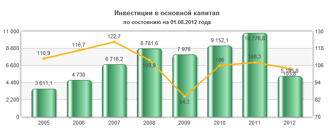 Индекс физического объема может рассчитываться как для всего объема инвестиций в основной капитал, так и для его основных составляющих - затрат на строительно-монтажные работы, машины, оборудование, инструменты и инвентарь, прочие инвестиции в основной капитал. Можно видеть, что самый высокий индекс физического объема инвестиций наблюдался в 2007 году (пик развития и роста как российской экономики, так и мировой экономики в целом), самый низкий – в 2009, когда объем инвестиций в основной капитал по сравнению с предыдущим годом снизился почти на 20%. На сегодняшний день наблюдается устойчивая тенденция роста объемов инвестиций в основной капитал и за первое полугодие 2012 года объем инвестиций составил 5195, 8 млрд. руб., а индекс физического объема 108% по отношению к аналогичному периоду прошлого года. На графике ниже представлена динамика инвестиций в основной капитал по месяцам. Можно видеть, что скачок объемов инвестиций приходится на декабрь 2007 года, когда объем инвестиций составил порядка 135% инвестиций предыдущего года. График также показывает, что текущий 2012 год по темпам роста инвестиций в основной капитал занимает промежуточное положение между 2006 и 2011 годом, еще не достигнув показателей первого, но уже превосходя показатели последнего.