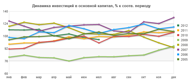 График показывает естественный спад инвестиций в основной капитал в 2009 г., связанный с повышенным риском вложений в тот период вследствие мирового экономического кризиса, а также восстановление уровня инвестиций в посткризисный период. Необходимо отметить, что объем инвестиций в денежном выражении не является ключевым показателем инвестиционной деятельности. В действительности, для целей анализа инвестиционной активности используют индекс физического объема инвестиций (отмечен на графике желтым). Индекс физического объема инвестиций в основной капитал (капитальных вложений) является одним из важнейших макроэкономических показателей. Он представляет собой отношение объемов инвестиций, осуществленных в сравниваемые периоды времени, из которого устранено влияние цен. Этот индекс рассчитывается по формуле: