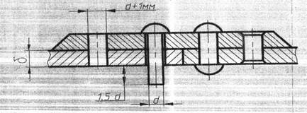 Соединение заклепками применяются в самых различных областях техники - металлоконструкции, судо- и самолетостроении, но постепенно вытесняются более экономичными сварными и клеевыми соединениями. Наиболее широкое применение получили заклепки с полукруглой (1), потайной (2), полу потайной (3) иплоской головкой (4) классов точности В и С, с покрытием и без него (рисунок 24). Рисунок 24 — Типы заклепок: а ~ с полукруглой головкой по ГОСТ 10299-80; б -- с потайной головкой по ГОСТ 10300 80; в - с полупотайной головкой по ГОСТ10301-80; г - с плоской головкой по ГОСТ 10303-80. Стандартизованы также пустотелые и полу пустотелые заклепки. Их применяют для соединения деталей, не требующих высокой плотности деталей из легко деформируемых материалов (кож, пластмасс, картона и т.д.). Заклепки изготавливаются из достаточно пластичных для образования головок материалов: сталей марок Ст2 (условное обозначение 00), СтЗ (02), стали 15, 15кп (03), етапи 10 и Юкп (01), нержавеющей стали - 12Х18Н9Т (21), латуни - Л63 (32), меди МЗ, МТ (38), алюминиевых сплавов - Д18 (36), АД1 (37) и др. Материал заклепок должен быть однородным с материалом соединяемых деталей. Примеры обозначений:! Заклепка С8> < 20.38.МЗЛ36 ГОСТ 10299-80, где С - класс точности, 8 - диаметр, 20 - длина, 38 - обозначение группы материала, МЗ - майка материала (медь), 136 - обозначение вида и толщины покрытия, с полукруглой головкой. Заклепка 8x20.00 ГОСТ 10300-80 класса точности В (не указывает), 8 - диаметр, 20 ~ длина, 00 - группа материала, в данном случае Ст2 (марку материала указывают только для групп 01, 03, 38, т.к. каждая их них содержит по две марки), без покрытия. Это обозначение применяют на учебных чертежах для заклепок из стали и указывают в спецификации или на полках линий-выносок, либо в табличке на поле чертежа. Стержень заклепки вставляется в сквозное отверстие скрепляемых деталей до упора головкой. Отверстия под заклепки пробивают или сверлят немнрго большего размера (на 0, 5-1 мм) диаметра заклепки. Свободный кокец выходит за пределы детали примерно на l, 5d и расклепывается с т|ем, чтобы придать ему форму сферической (полукруглой), конической ((потайной) или другой головки (рисунок 25). По назначению заклепочные швы делятся на прочные, плотные (o(j> ec-печивающие герметичность) и плотно-прочные; по конструктивным признакам - одно-, двух-, трехрядные и т.д.; с листами, расположенными