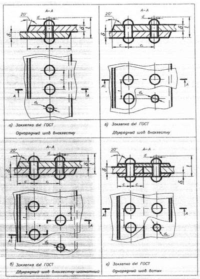Рисунок 25 - Последовательность выполнения соединения заклепкой встык с одной или двумя накладками, внахлестку; с цепным или щах-матным расположением заклепок. Если шов содержит заклепки одного типа с одинаковыми размерами, то на чертеже ее вычерчивают в одном