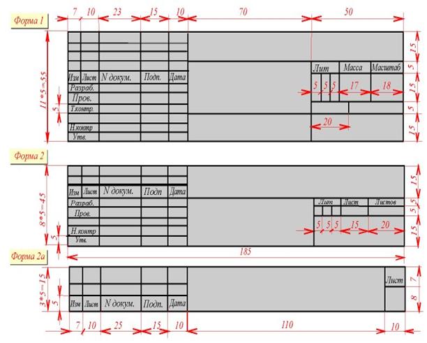 В графах основной надписи указывают: в графе 1 – наименование изделия; в графе 2 – обозначение документа; в графе 3 – обозначение материала детали; в графе 4 – литеру, присвоенную данному документу; в графе 5 – массу изделия по ГОСТ 2.109-73; в графе 6 – масштаб; в графе 7 – порядковый номер листа (на документах, состоящих из одного листа, графу не заполняют); в графе 8 – общее количество листов документа (графу заполняют только на первом листе); в графе 9 – наименование предприятия, выпускающего документ; в графе 10 – заполняют при необходимости по усмотрению разработчика, например: «Начальник отдела», «Рассчитал»; в графе 11 – фамилии лиц, подписавших документ; в графе 12 – подписи лиц, фамилии которых указаны в графе 11; в графе 13 – дата.