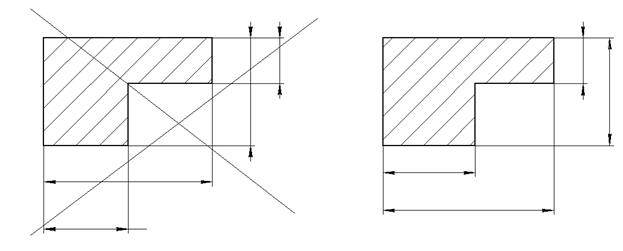 Размерные линии предпочтительно наносить вне контура изображения. Не допускается использование линии контура, осевые, центровые и выносные линии в качестве размерных. Недопустимо пересечение размерных и выносных линий, показанное на зачеркнутом рис. 3.6 а. Правильное нанесение размеров для этого случая приведено на рис. 3.6 б.