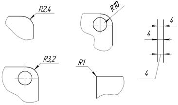 Радиусы скругления, размер которых в масштабе чертежа 1 мм и менее, на чертеже не изображают и размеры их наносят, как показано на рис. 3.23.