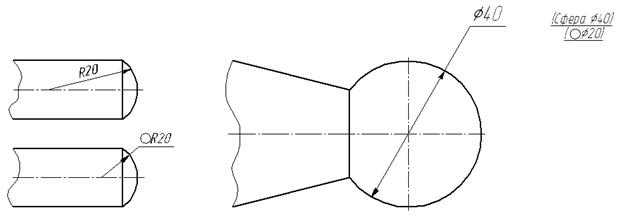 При указании размера диаметра во всех случаях перед размерным числом наносят знак Ø. Перед размерным числом диаметра (радиуса) сферы также наносят знак «О» Ø (R) без надписи «Сфера» (рис. 3.19).