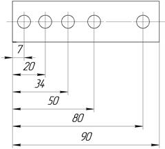 Вопрос, какие размеры следует наносить на чертеже, решается с учетом технологии изготовления деталей и контроля изготовления. Как правило, размеры полных окружностей ставятся диаметром, неполных окружностей – радиусом. Когда требуется задать расстояния между окружностями, например, изображающими отверстия, задают, расстояния между центрами окружностей и расстояние от центра любой окружности до одной из поверхностей детали. Поверхности, от которых задают размеры других элементов детали, называют базовыми поверхностями или базами. Существует несколько способов нанесения размеров: 1) от общей базы (рис. 3.27); в качестве базовой поверхности выбрана левая поверхность планки, от которой проставлены размеры всех отверстий. Такая система имеет преимущество, но при этом размеры являются независимыми друг от друга, ошибка одного из них не отражается на других.