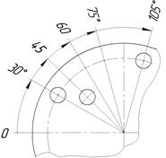 При нанесении размеров, определяющих расстояние между равномерно расположенными одинаковыми элементами изделия (например, отверстиями), рекомендуется вместо размерных цепей наносить размер между соседними элементами и размер между крайними элементами в виде произведения количества промежутков между элементами на размер промежутка (рис. 3.30). При большом количестве размеров, нанесенных от общей базы, допускается наносить линейные и угловые размеры, как показано на рис. 3.31, при этом проводят общую размерную линию от отметки «0» и размерные числа наносят в направлении выносных линий у их концов.