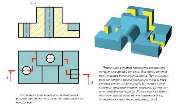 Фигуpы сечения, полученные pазличными секущими плоскостями сложного pазpеза, не pазделяют одну от дpугой никакими линиями (pис. 4.7). Сложный ступенчатый разрез помещают на месте соответствующего вида (рис. 4.7) или в любом месте чертежа.