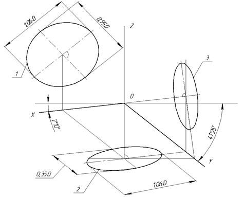 5.1.2. Диметрическая проекция Положение аксонометрических осей проводится на рис. 5.5. Для построения угла, приблизительно равного 7º 10´, строится прямоугольный треугольник, катеты которого составляют одну и восемь единиц длины; для построения угла, приблизительно равного 41º 25´ - катеты треугольника, соответственно, равны семи и восьми единицам длины. Коэффициенты искажения по осям ОХ и OZ k=n= 0, 94 а по оси OY – m = 0, 47. При округлении этих параметров принимается k=n=1 и m=0, 5. В этом случае размеры осей эллипсов будут: большая ось эллипса 1 равна 0, 95D и эллипсов 2 и 3 – 0, 35D (D – диаметр окружности). На рис. 5.5 большие оси эллипсов 1, 2 и 3 расположены под углом 90º к осям OY, OZ и OX, соответственно.