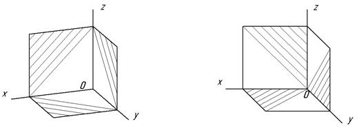 5.4. Штриховка сечений Линии штриховки сечений (разрезов) в аксонометрических проекциях наносятся параллельно одной из диагоналей квадратов, лежащих в соответствующих координатных плоскостях, стороны которых параллельны аксонометрическим осям (рис. 5.10).