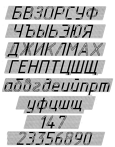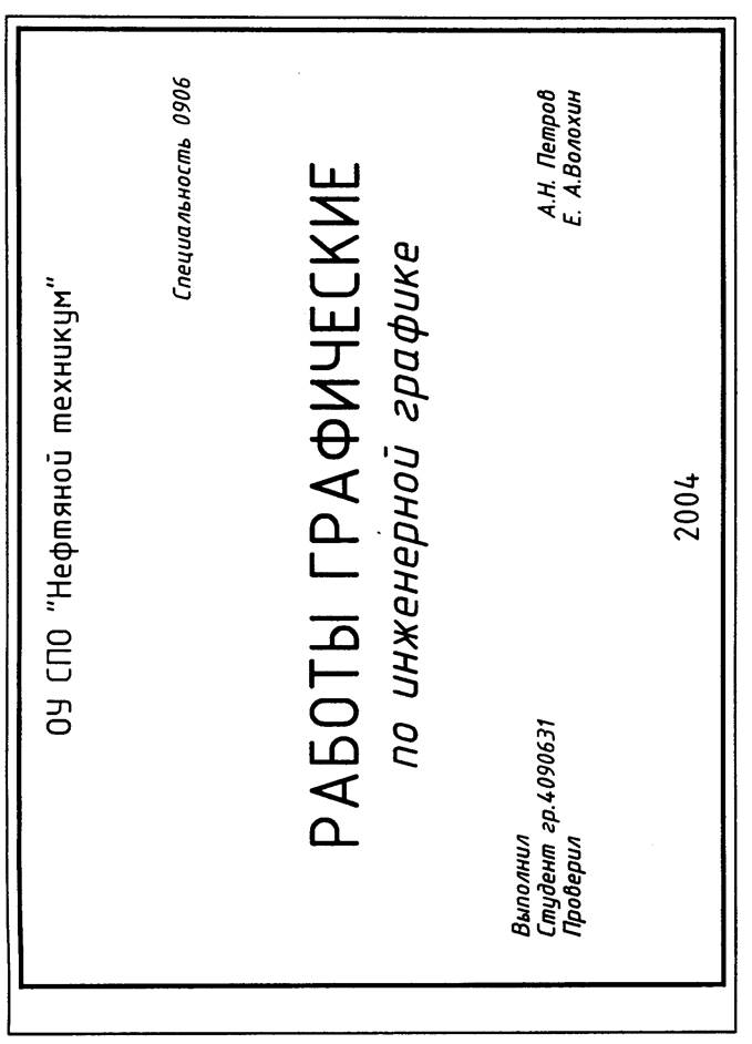 Порядок выполнения листа: На листе формата А3 выполнить рамку. По размерам, заданным на рисунке 5 разлиновать лист и выполнить следующие надписи чертежным шрифтом. Строки 1, 2, 3, 4, 5, 6 - выполняются шрифтом № 7, наклон 75*, тип Б. 1 -- специальность 130502, 130503, 130504, 2 -- Выполнил 3 -- Студент гр. 3ИС11 4 -- Проверил 5 -- А. Н. Петров 6 -- Е. А. Волохин Строки 7, 8 - выполняются шрифтом № 10, тип Б. 7 -- ОУ СПО " Нефтяной техникум" 8 -- 2004 Рисунок 5 - разметка титульного листа Строка 9 - выполняется шрифтом №20 тип Б, образец дан на рисунке 7, Строка 9 - все прописные (заглавные) без наклона, Строка 10 - выполняется шрифтом №14 тип Б, образец дан на рисунке 7, Строка 10 - все строчные (высота 10 мм) с наклоном 75° Надписи строк 7, 8, 9, 10 выполняются симметрично относительно вертикальной оси формата. Перенос частей слов на титульном листе не допустим.Проверить лист, удалить лишний линии, обвести все надписи, соблюдая толщину линий шрифта в соответствии с ГОСТ 2.304 — 81.Образец выполнения листа дан на рисунке 6. Образец начертания букв и цифр дан на рисунке 7. Исходя что d-ширина шрифта d=1/10*h определяем ширину буквы по таблице 1