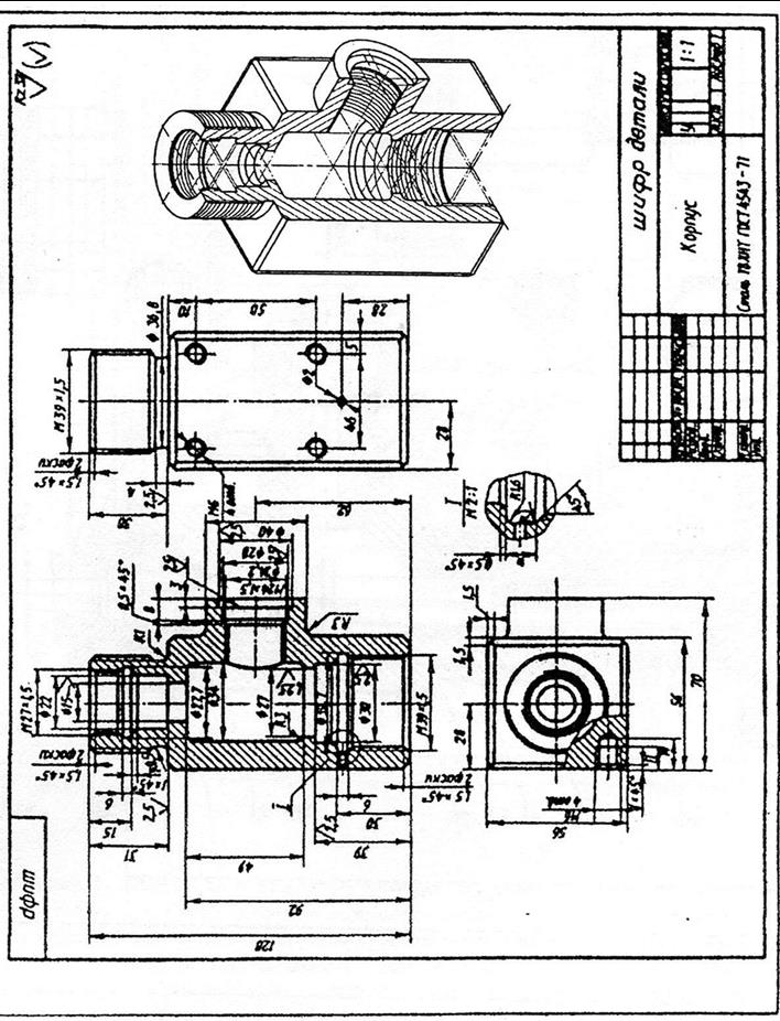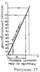 Так как на сборочных чертежах отсутствуют размеры отдельных деталей, то при деталировании все необходимые размеры определяют по масштабу. В методичке размеры чертежей, как правило, уменьшают и они не соответствуют масштабу, указанному в основной надписи. В этом случае для определения натуральных размеров детали пользуются графиком масштабов. Для того, чтобы определить истинные размеры детали, необходимо выяснить, во сколько раз уменьшен (или увеличен) при печатании изображенный чертеж. С этой целью находим на чертеже самый большой размер (чем больше размер, тем меньше погрешность при расчете). Например, размер 120 при непосредственном измерении на рисунке оказался равным 52 мм. Разделив 120 на 52 получаем коэффициент уменьшения равным ≈ 2, 307. Теперь, чтобы узнать размеры, не указанные на сборочном чертеже, надо измерять их на чертеже и полученные величины умножить на 2, 307.