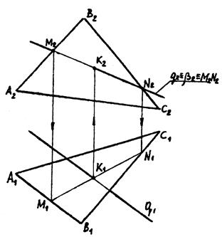 Плоскость а (А, В, С) и прямая g не перпендикулярны плоскостям проекций. Построить точку пересечения прямой с плоскостью - В качестве вспомогательной плоскости можно взять горизонтально - проецирующую или фронтально - проецирующую плоскость, проходящую через g. В любом случае линия пересечения с плоскостью α представляет собой прямую линию MN, которая совпадает на основной проекции с проецирующей плоскостью, другая проекция линии пересечения M1N1 определяется по принадлежности к плоскости α.