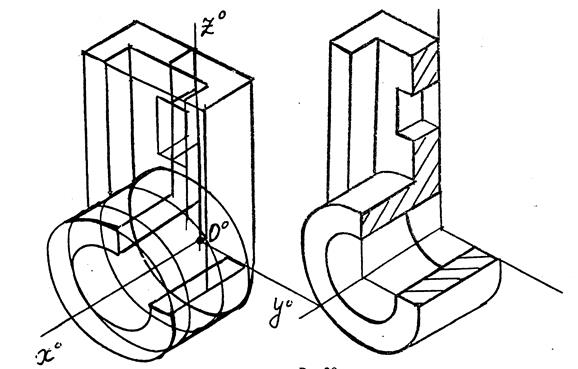 Изометрическое изображение детали выполняется с использованием имеющегося ее ортогонального (комплексного) чертежа. В первую очередь необходимо жестко связать ортогональную систему координат с изображаемой деталью. Эту систему следует нанести и обозначить на комплексном чертеже детали, а затем изобразить и обозначить изометрические оси (Рис. 18). Точки на изометрическом чертеже строятся по их координатам, взятым с комплексного чертежа. Сначала следует построить крупные обобщенные формы: призму, цилиндр и т.д., не принимая во внимание мелкие скругления, отверстия, пустоты, а затем перейти к более мелким формам.