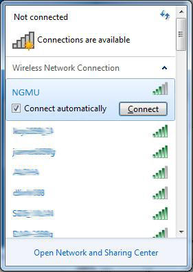 Включите WiFi адаптер. В правом нижнем углу экрана появится индикатор беспроводной сети. Щёлкните по нему правой кнопкой мыши и выберите пункт «Подключиться к сети». Выберите из списка сеть с именем NGMU и нажмите кнопку «Подключиться».
