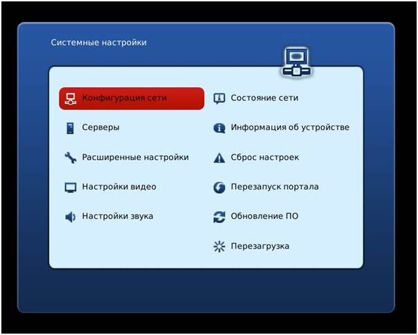 Включите источник питания в розетку. Загорается синий индикатор на лицевой панели приставки. Переключите ваш телевизор в режим HDMI или Composite в зависимости от того каким кабелем подключена приставка – HDMI или 3xRCA. 1. Во время загрузки приставки на экране телевизора появятся по очереди: Loading, Загрузка портала..., при появлении сообщения Загрузка портала... нажимаем и держим на пульте приставки кнопку SETUP, отпускаем ее при появлении сообщения Загрузка внутреннего портала..., попадаем во внутренний портал: