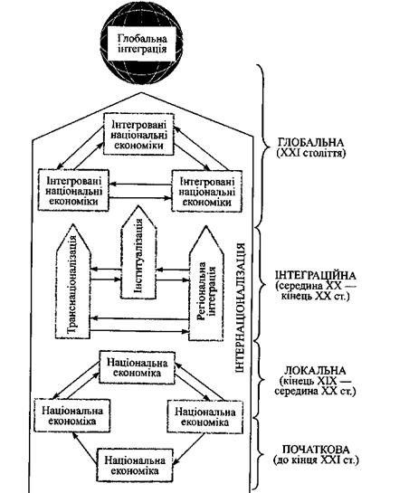 З огляду на сутність інтеграційного процесу і особливості його розвитку в сучасних умовах можна, з одного боку, якісно охарактеризувати стадії (етапи) інтернаціоналізації, а з другого — визначити її можливий кінцевий результат (рис. 1.4). На стадії початкової інтернаціоналізації національні економіки взаємодіють на основі розвитку традиційних форм міжнародних економічних відносин (МЕВ) — міжнародної торгівлі, міжнародного руху капіталу та робочої сили. Ці форми реалізуються відносно автономними національними господарськими суб'єктами. Регулювання МЕВ відбувається переважно на національному рівні, хоча певну роль (насамперед, координуючу) відіграють і міжнародні організації. Рівень початкової інтернаціоналізації визначається ступенем влучення національної економіки до системи міжнародних економічних відносин (якісний бік); питомою вагою і значущістю міжнародної складової у формуванні результатів економічної діяльності (кількісний бік).