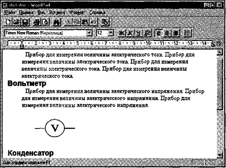 В этом упражнении мы создадим иллюстрированный словарь терминов, введенных в файл list.txt в упражнении 7, 1. 1.Запустите текстовый процессор WordPad (Пуск > Программы > Стандартные > WordPad). 2. Откройте текстовый файл list.txt. 3. Дайте команду Файл > Сохранить как, в списке Тип файла выберите пункт Word для Windows 6.0 и сохраните файл под именем dict.doc. 4. Выделите первое слово документа (Амперметр). На панели форматирования задайте шрифт Arial (Кириллица), размер шрифта — 14 пунктов, выберите полужирное начертание. 5. Нажмите клавишу END, чтобы снять выделение, а затем — клавишу ENTER. 6.