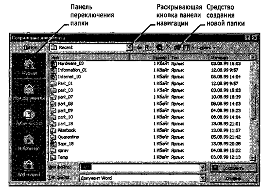 Диалоговое окно Сохранение документа в текстовом процессоре Microsoft Word 2000, представленное на рис. 10.3, отличается от аналогичного окна ранее рассмотренных нами стандартных приложений. Оно предполагает сохранение не только в папку \Мои документы, но и в некоторые иные папки. В левой части окна Сохранение имеется пять кнопок, позволяющих быстро выбрать локацию сохраняемого файла: Журнал — логическая папка. Если нужно сохранить документ в одну из папок, которой пользовались в последнее время, это очень удобное средство доступа. Мои документы — традиционная папка для хранения авторских документов в операционных системах Windows 95 и Windows 98. Рабочий стол — не слишком удобное место для хранения документов, поскольку Рабочий стол принято содержать «в чистоте». Однако если документ будет использоваться очень часто и всегда должен быть «на виду», его можно сохранить на Рабочий стол. Избранное — особая логическая папка пользователя, предназначенная для хранения ярлыков Web-страниц. Ее нецелесообразно использовать для сохранения текстовых документов, но для открытия документов она может использоваться активно. Web-папки — особые папки, хранящиеся в Web-структурах, например в World Wide Web или в корпоративной сети Intranet. В общем случае при использовании Web-папок сохранение документа происходит не на локальном компьютере, а на удаленном Web-сервере. При необходимости сохранить документ в произвольную папку, не представленную в данном списке, следует выполнить навигацию по файловой структуре с использованием раскрывающей кнопки на правом краю поля Папка.