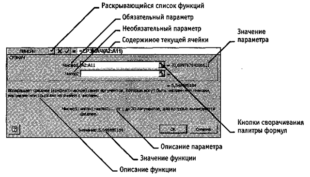 Рис. 12.4. Строка формул и палитра формул Ввод параметров функции. В ходе ввода параметров функции палитра формул изменяет вид. На ней отображаются поля, предназначенные для ввода параметров. Если название параметра указано полужирным шрифтом, параметр является обязательным и соответствующее поле должно быть заполнено. Параметры, названия которых приводятся обычным шрифтом, можно опускать. В нижней части палитры приводится краткое описание функции, а также назначение изменяемого параметра. Параметры можно вводить непосредственно в строку формул или в поля палитры формул, а если они являются ссылками — выбирать на рабочем листе. Если параметр задан, в палитре формул указывается его значение, а для опущенных параметров — значения, принятые по умолчанию. Здесь можно также увидеть значение функции, вычисленное при заданных значениях параметров (см. рис.12.4). Правила вычисления формул, содержащих функции, не отличаются от правил вычисления более простых формул. Ссылки на ячейки, используемые в качестве параметров функции, также могут быть относительными или абсолютными, что учитывается при копировании формул методом автозаполнения.