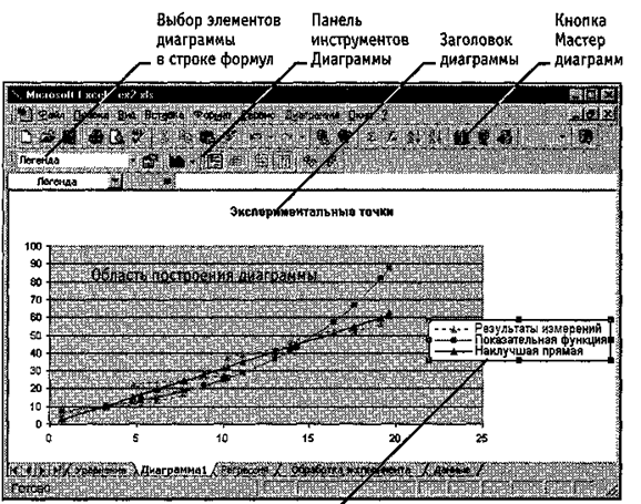 Редактирование диаграммы. Готовую диаграмму можно изменить. Она состоит из набора отдельных элементов, таких, как сами графики (ряды данных), оси координат, заголовок диаграммы, область построения и прочее. При щелчке на элементе диаграммы он выделяется маркерами, а при наведении на него указателя мыши — описывается всплывающей подсказкой. Открыть диалоговое окно для форматирования элемента диаграммы можно через меню Формат (для выделенного элемента) или через контекстное меню (команда Формат). Различные вкладки открывшегося диалогового окна позволяют изменять параметры отображения выбранного элемента данных. Если требуется внести в диаграмму существенные изменения, следует вновь воспользоваться мастером диаграмм. Для этого следует открыть рабочий лист с диаграммой или выбрать диаграмму, внедренную в рабочий лист с данными. Запустив мастер диаграмм, можно изменить текущие параметры, которые рассматриваются в окнах мастера, как заданные по умолчанию. Чтобы удалить диаграмму, можно удалить рабочий лист, на котором она расположена (Правка > Удалить лист), или выбрать диаграмму, внедренную в в рабочий лист с данными, и нажать клавишу DELETE.