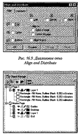 Диалоговое окно Align and Distribute (Выровнять и распределить) (рис. 16.9) открывается после щелчка на одноименной строке в меню Arrange (Упорядочить). На вкладке Align (Выравнивание) предлагаются средства выравнивания объектов относительно центра или края страницы, а также относительно других объектов или опорных точек направляющей сетки. На вкладке Distribute (Распределение) задают равномерное распределение объектов относительно других объектов или страницы документа. Управление выравниваем и распределением в сочетании с возможностью явно задавать размеры и положение объектов на панели свойств позволяет выполнять чертежи с точностью до третьего знака после запятой, что вполне достаточно для подавляющего большинства инженерных задач.